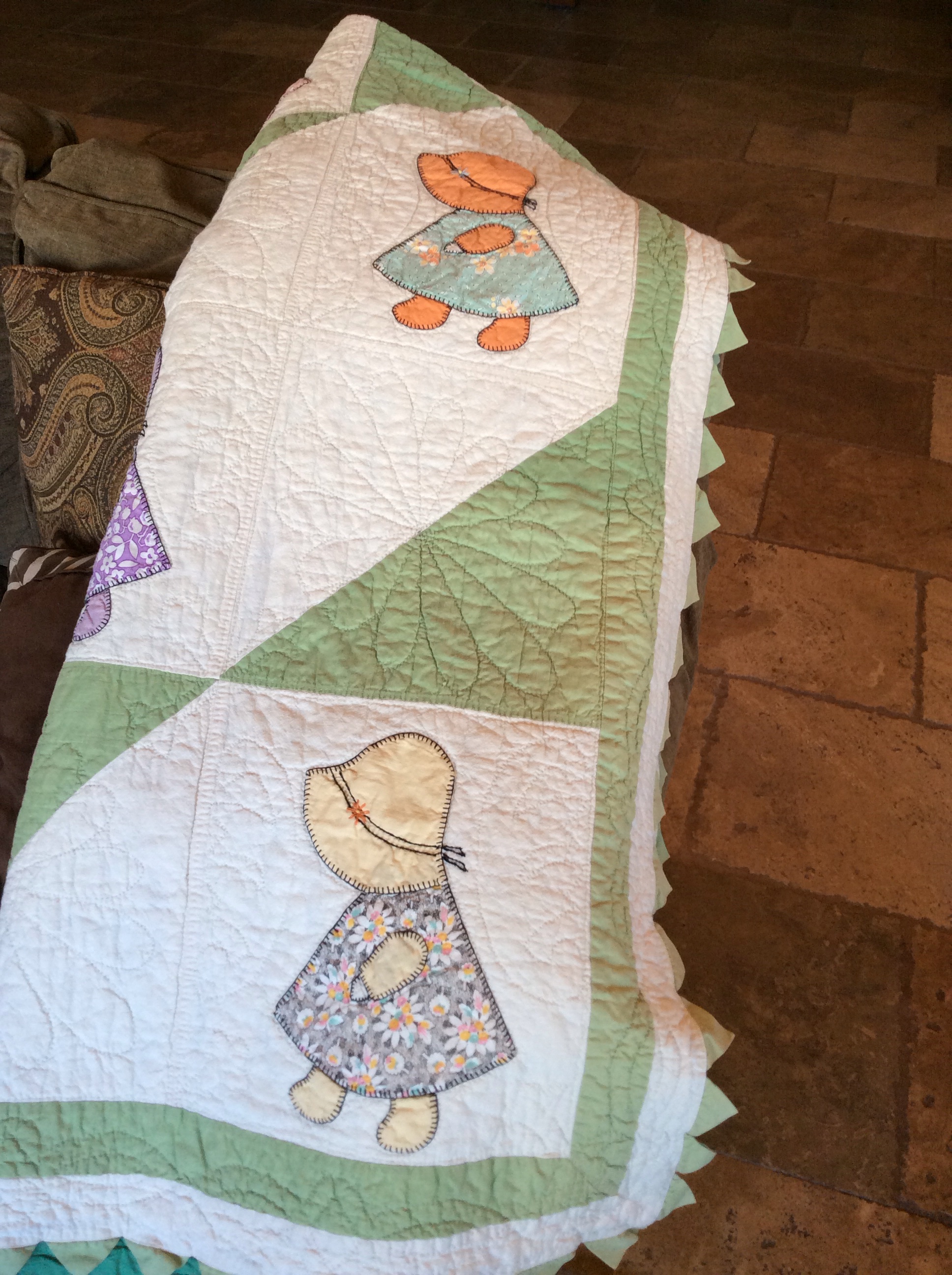 Today I wanted to share a vintage quilt find. A girl friend found this little lovely for me at a local consignment store. A Sunbonnet Sue quilt.